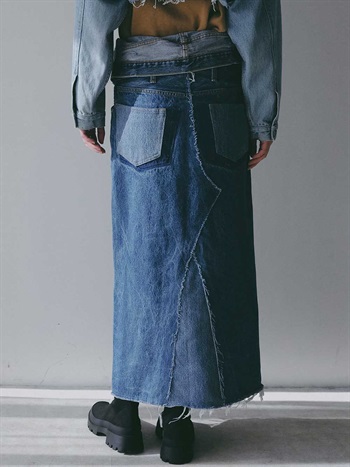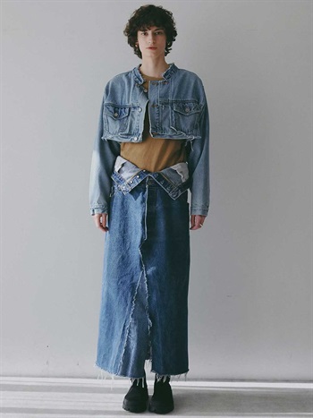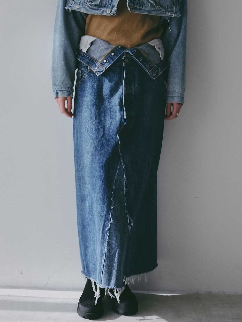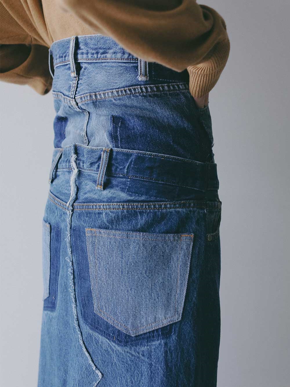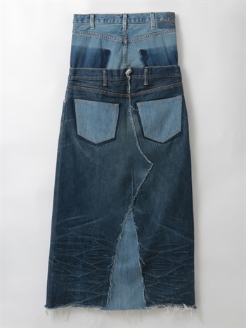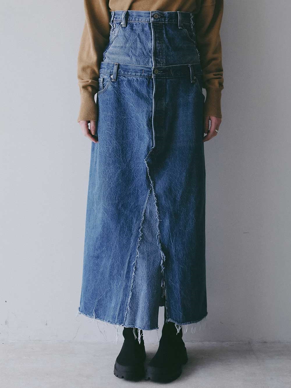 古着とデニム糸を使用し、オリジナルテキスタイルを組み合わせて作成した生地の、デニムスカートです。