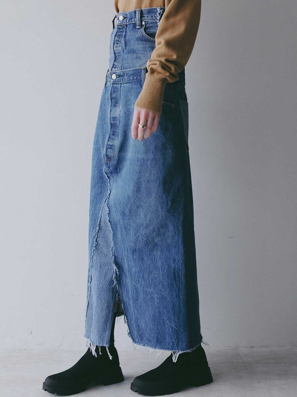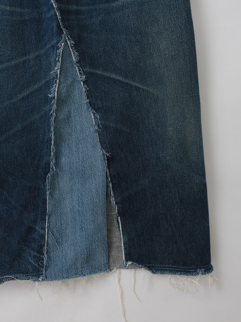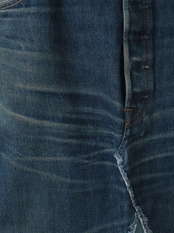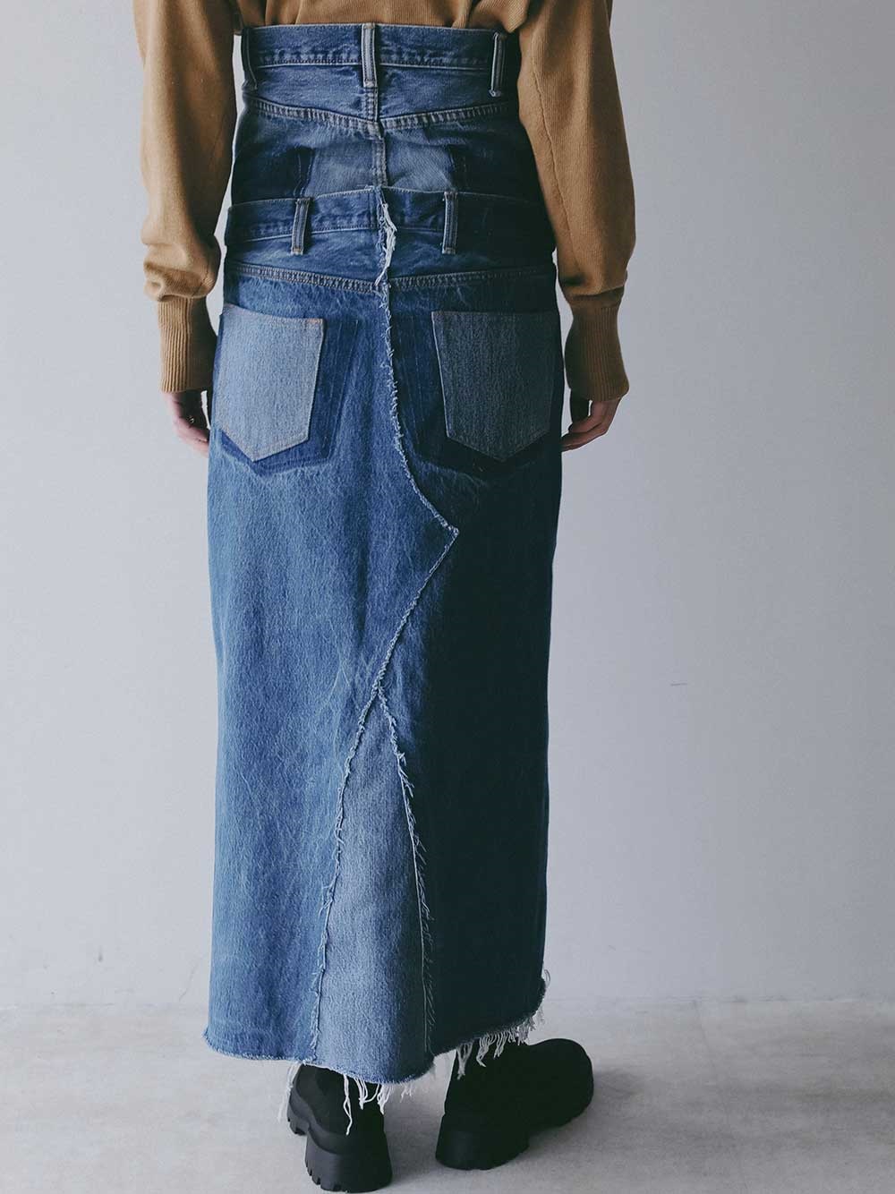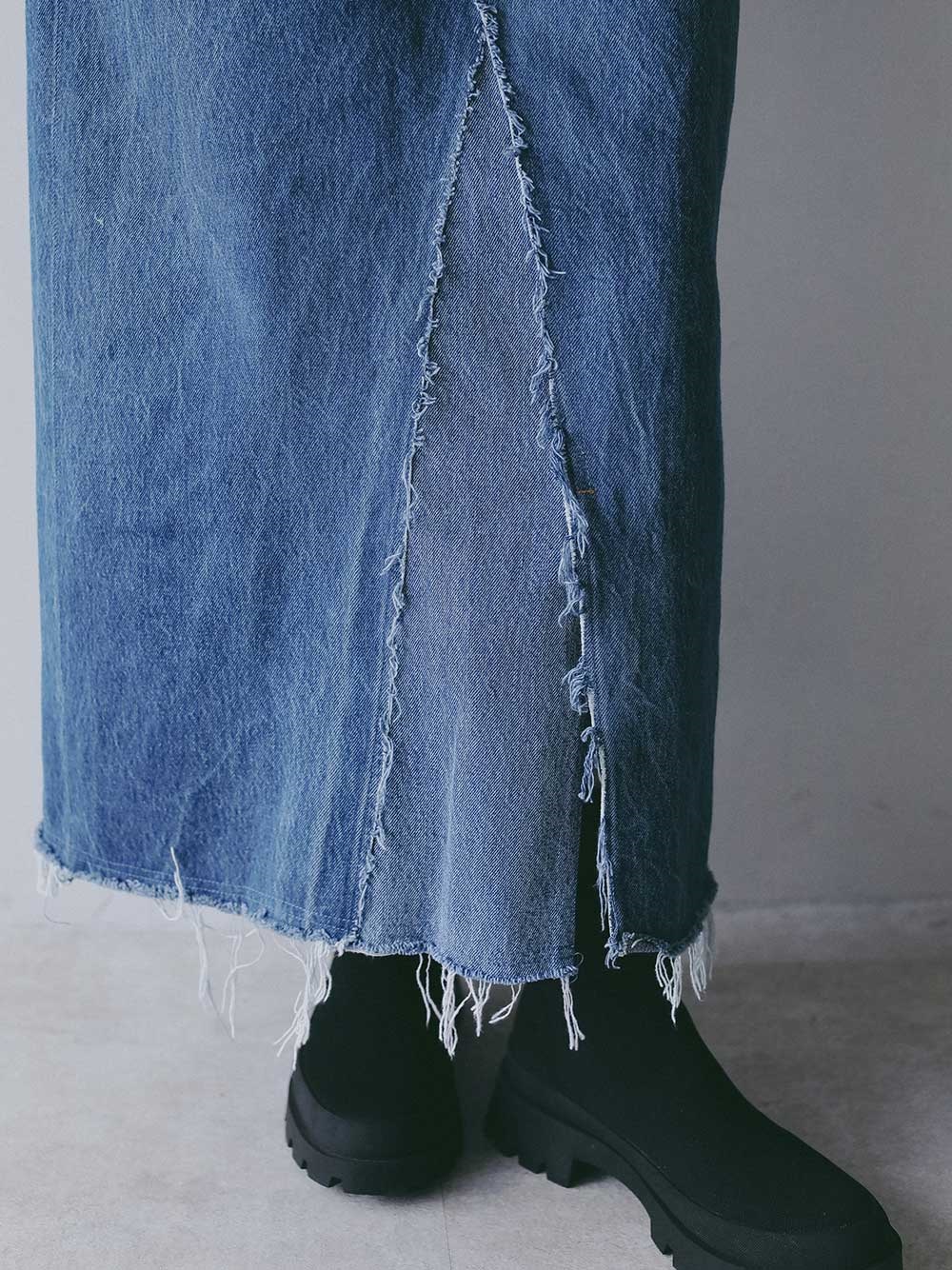 古着とデニム糸を使用し、オリジナルテキスタイルを組み合わせて作成した生地の、デニムスカートです。