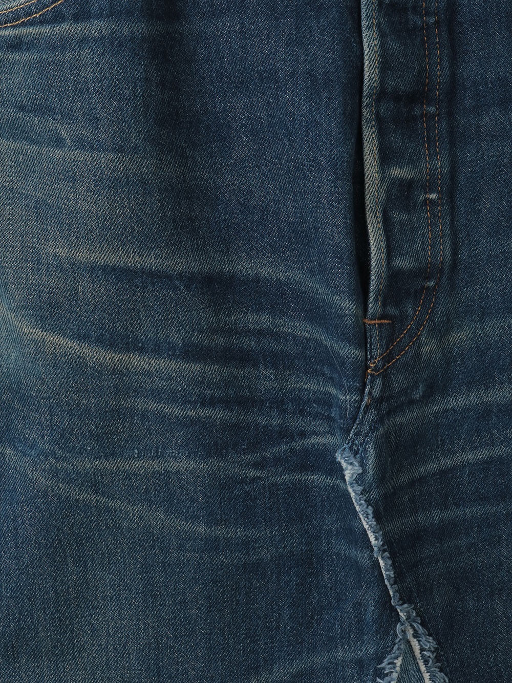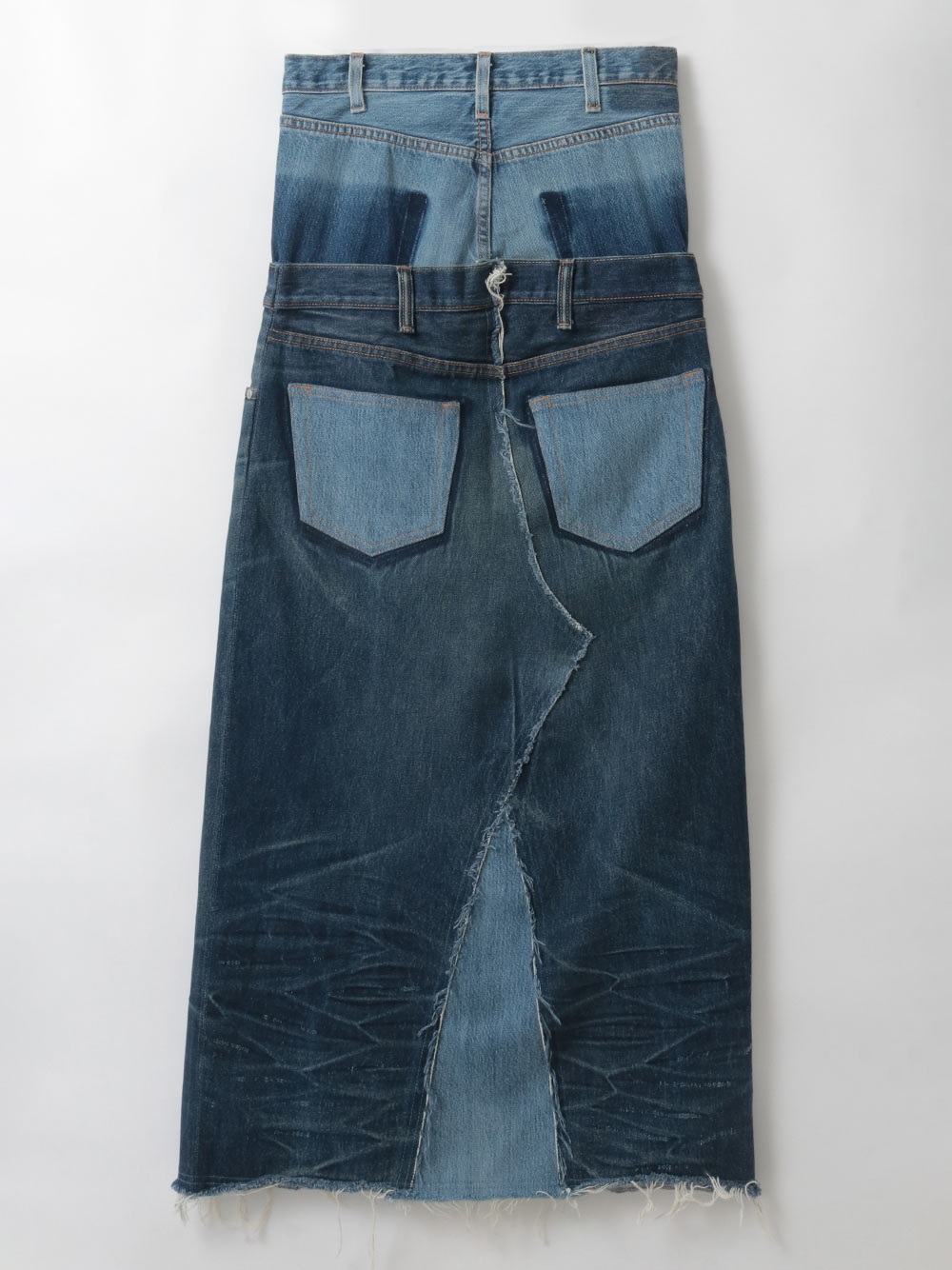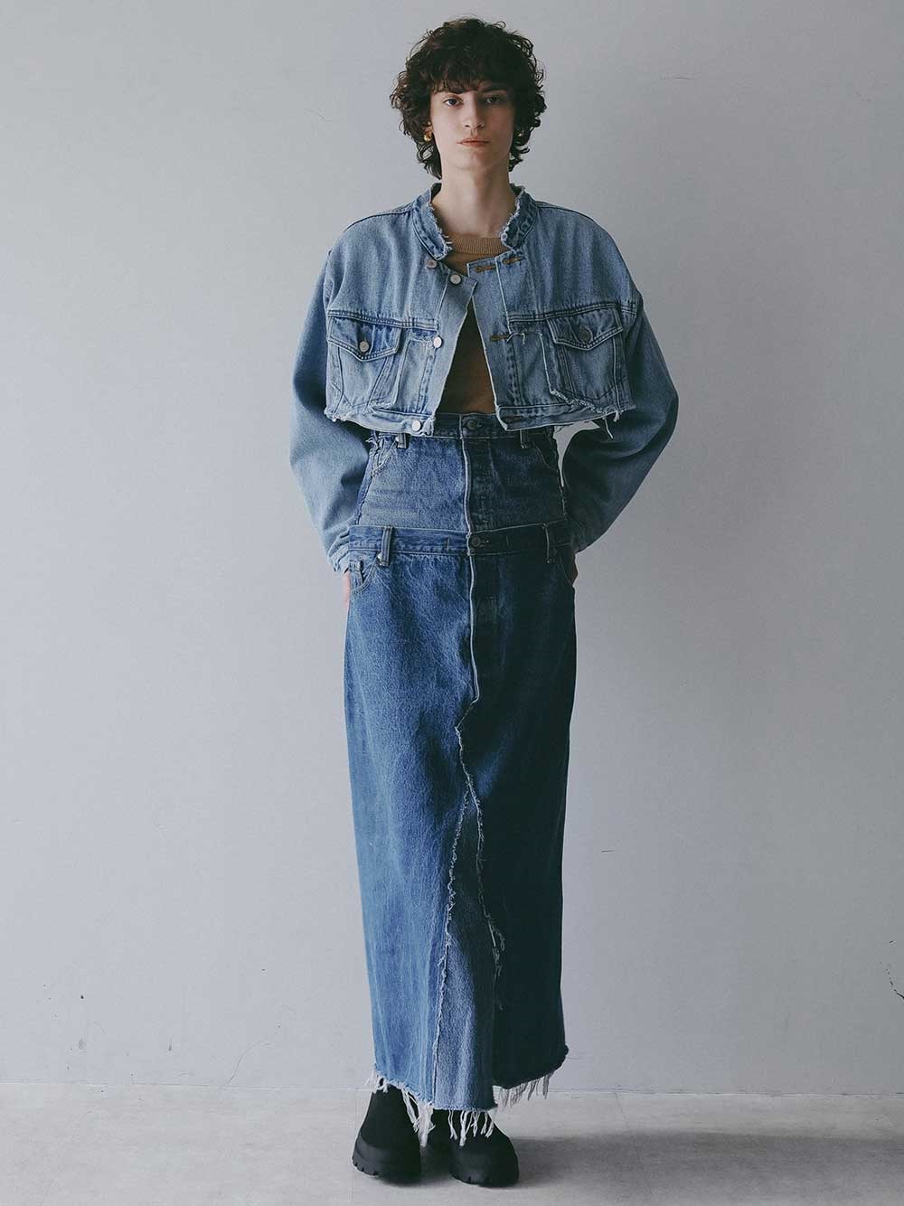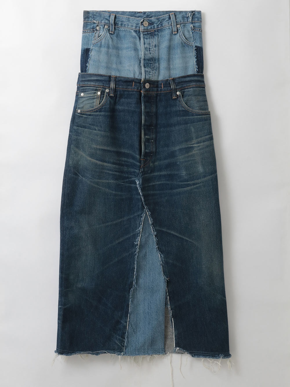 古着とデニム糸を使用し、オリジナルテキスタイルを組み合わせて作成した生地の、デニムスカートです。